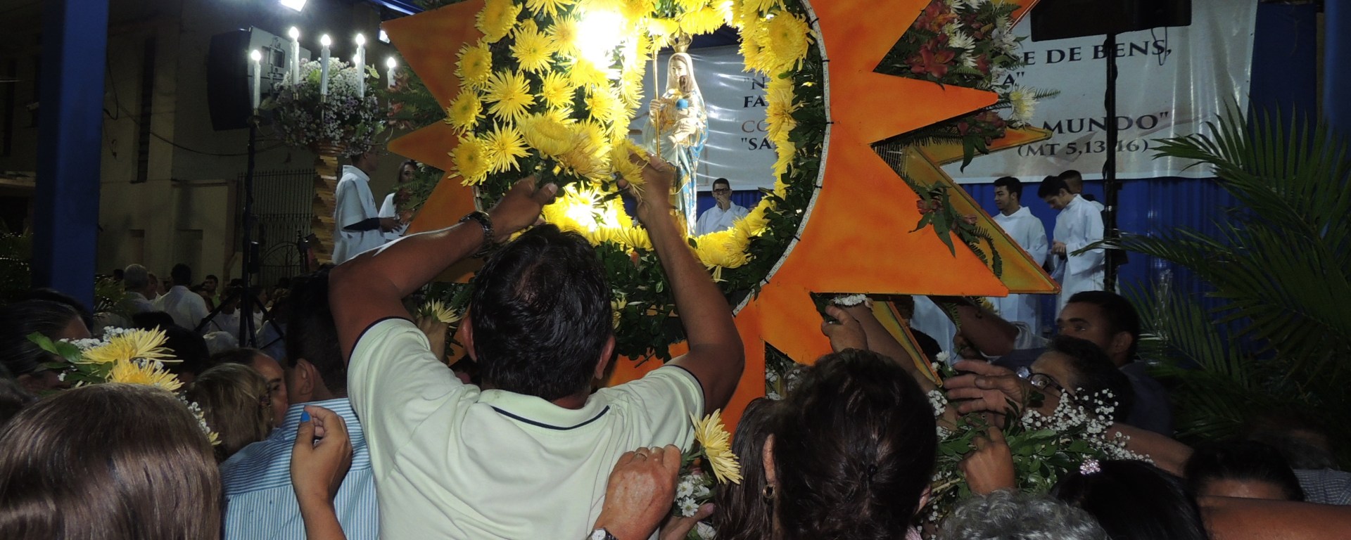 Entre as folhas verdes, flores amarelas decoravam o andor formando um o círculo, um sol, onde foi a imagem de Nossa Senhora foi posta.