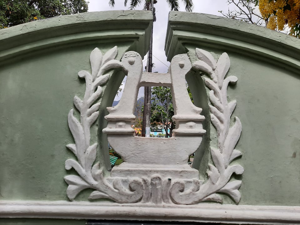 A obra é enfeitada de arabescos e exibe uma lira adornada de folhas simbolizando o lugar de retretas. Nessa época do ano, parte dele, fica à sombra dos cachinhos de ouro da Acácia Imperial.